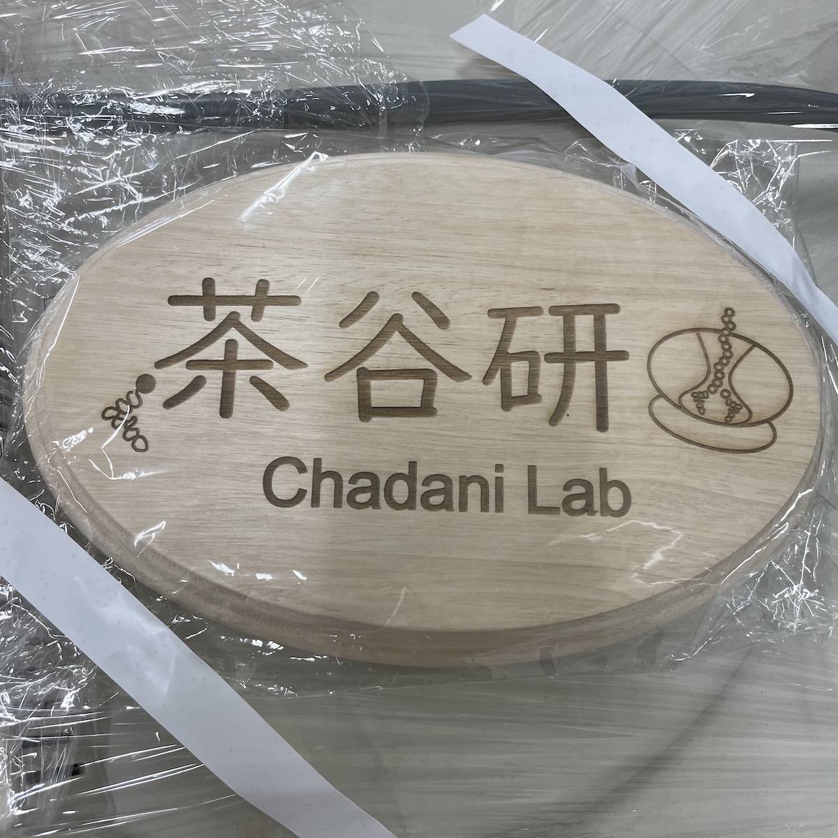 茶谷研発足を記念して学生がプレゼントした手作りのラボ表札(2023年3月20日)