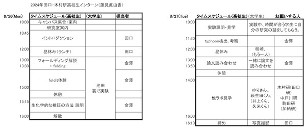 高校生インターンシップを8月26-27日に開催しました。蓮見さん(修士2年)が企画を提案してくれて、彼女の実行力とラボの学生たちのサポートで実現しました。(細胞制御工学研究センター木村研究室と合同開催)