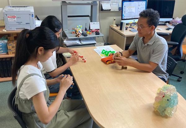 1)タンパク質科学の基礎に関する田口による講義(学部1年生向けのパズルやGFPを使ってフォールディングを教えたりする内容)
