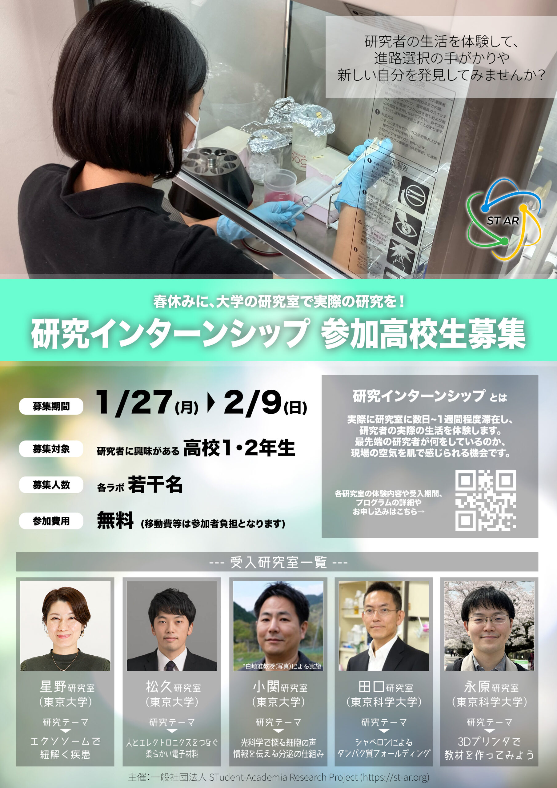 昨年8月に引き続き、高校生研究インターンシップ(研究室体験)を3月27-28日に開催しました。(ST-AR Projectとの共催)。参加者は4名(1人は当日欠席)。