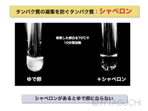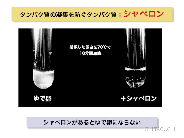 タンパク質は基本的には自分自身でフォールディングできます(アンフィンゼンのドグマ)が、フォールディングの途中は不安定で、その不安定なもの同士が集まると不可逆に凝集体になってしまいます(ゆで卵のイメージ)。GroELなどシャペロニンの第一の機能は、リボソームで産まれてきた新生ポリペプチドや何らかの理由で変性した蛋白質(まとめて基質タンパク質)を「結合」することで凝集になるのを阻止することです。ですので、下図の写真にあるように、卵白が熱で凝集するような条件(つまり、ゆで卵)でシャペロン(GroEL)を溶液に加えておくと、凝集ができなくなります(ただし、この実験で使っているGroELは温泉に住んでいる好熱菌から取ったものです)。