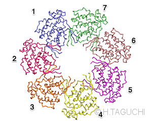 【シャペロニン】シャペロニンはタンパク質のフォールディングを助けるすべての細胞に必須の分子シャペロンの代表です。シャペロンの概念が醸成されていくきっかけにもなりました(シャペロンとシャペロニンは混同されがちですが、シャペロンはシャペロン的に機能するタンパク質の総称で、代表的なものにHsp70/DnaK、Hsp90、Hsp104/ClpB、そしてシャペロニン(GroEL/CCT)などがあります。シャペロニンはシャペロンという大きな集団の一つにすぎません)